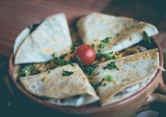 Pan pita con queso cheddar, pico de gallo y carne a elección.