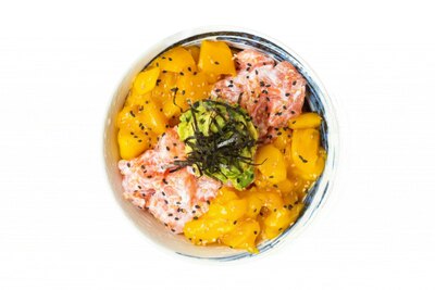 Arroz Sushi, Langostino Premium, Mango y Coco, Cilantro, Salsa de Sésamo y un toque de Teriyaki.