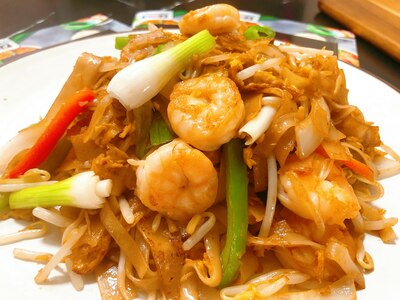 Wok fried flat-rice noodles with eggs, spring onion, beansprout, pepper, carrot, onion and tamarind sauce, garnished with peanuts, lime .
