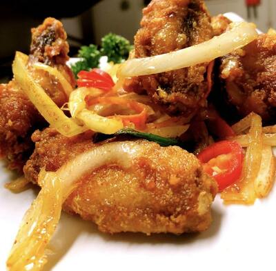 Crispy Potato Chips and golden crispy Chicken & wings wok fried with Garlic, Onions, Salt, Pepper & Chillies.🌶️🌶️🌶️